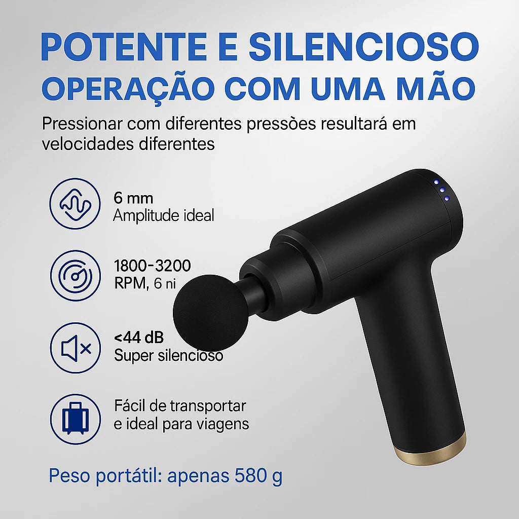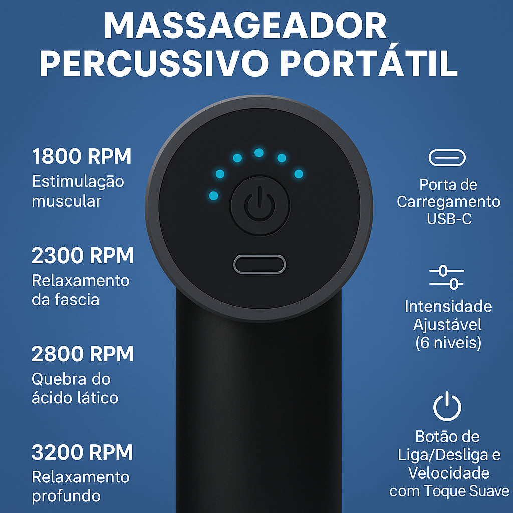 Inspirado nas ferramentas usadas por equipes esportivas de alto nível, este massageador possui motor de alta frequência com até 3200 rotações por minuto, proporcionando massagens profundas e eficazes. Ideal para aliviar tensões, reduzir dores e acelerar a recuperação muscular após treinos ou jornadas cansativas.