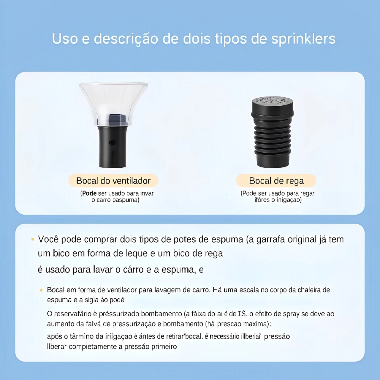 Nosso pulverizador possui um canhão pneumático de alta eficiência que cria espuma densa e uniforme, mesmo com pressão manual. Com os 2 bicos ajustáveis, você escolhe o padrão ideal de uma névoa suave até uma espuma de neve espessa, garantindo resultados profissionais em qualquer situação.