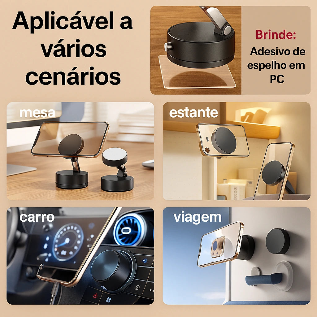 Projetado para oferecer máxima versatilidade, este suporte magnético é ideal para uso em diversos ambientes: mesa, estante, carro ou durante viagens.